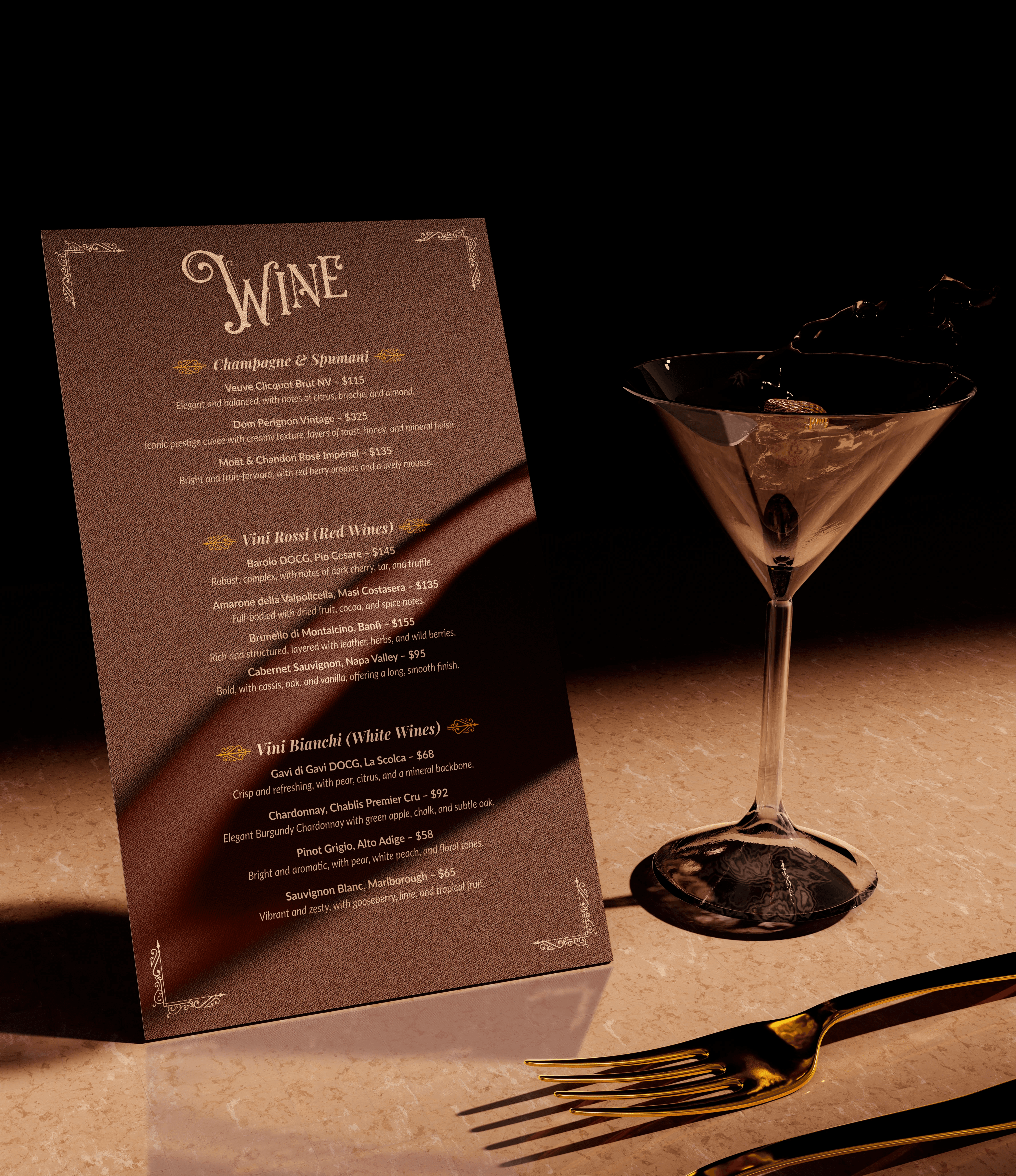 To bring the romance, depth, and craftsmanship of Italian culinary tradition into a modern steakhouse experience—creating a place where exceptional food, premium wine, and warm hospitality come together.